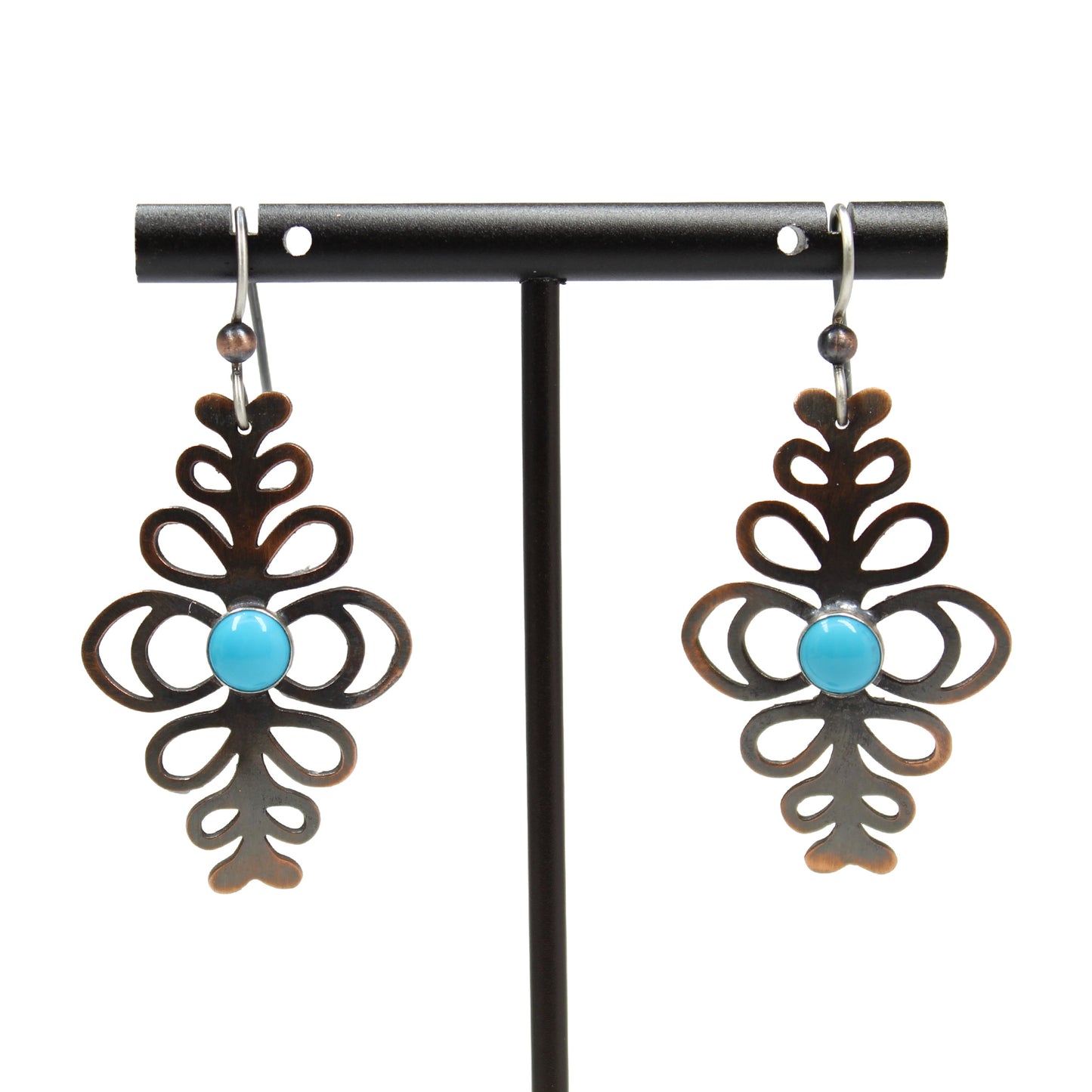 The intricate openwork design gives them a substantial look without feeling heavy, making them comfortable for all-day wear. The classic combination of copper and turquoise makes these earrings a versatile addition to any jewelry collection, perfect for a bohemian look, Southwest style, or simply adding a touch of rustic sophistication to your everyday outfit.