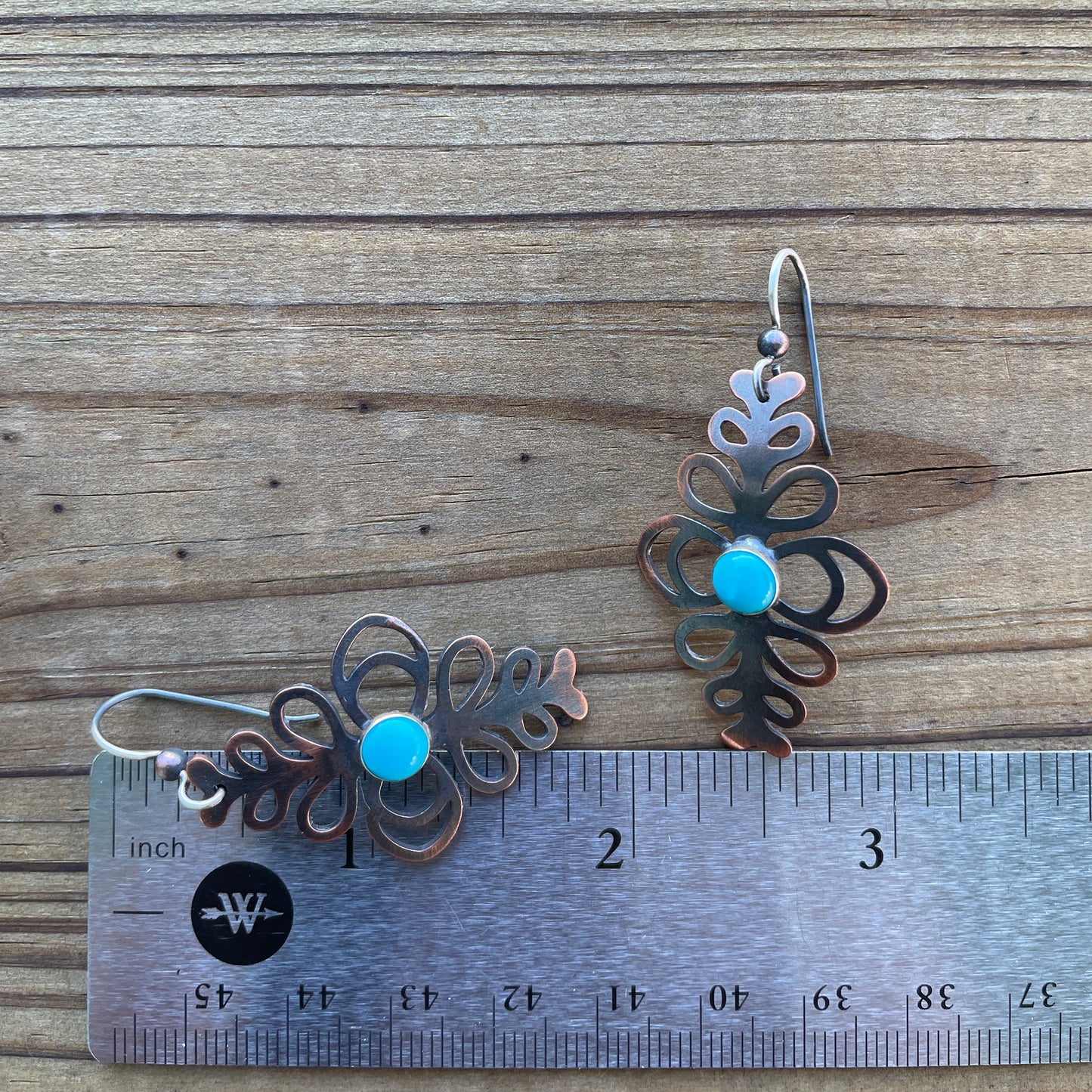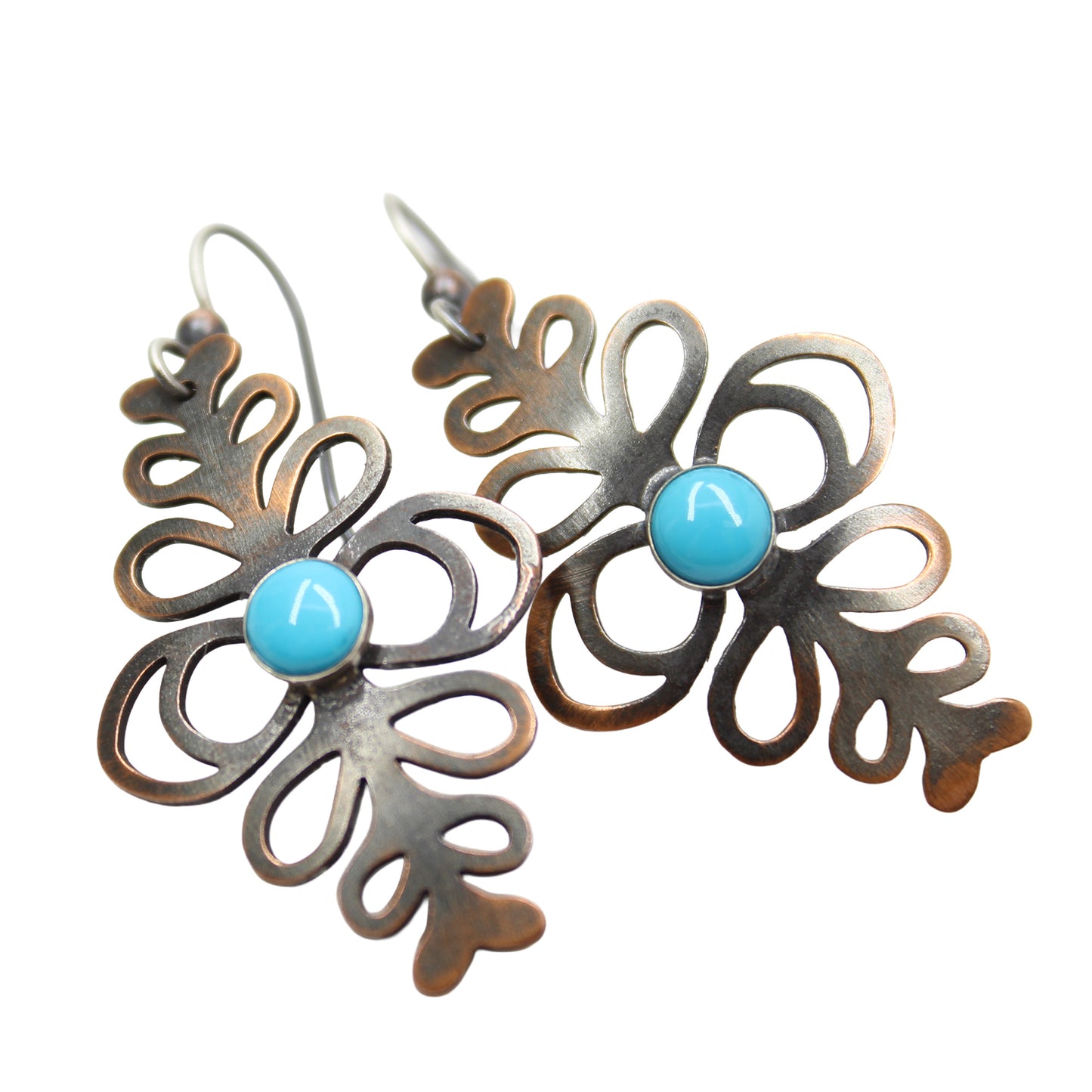 Materials: Natural Arizona Mined Turquoise Cabochons, Oxidized (Antiqued) Copper Sheet, Sterling Silver Ear Wires (for sensitive ears).