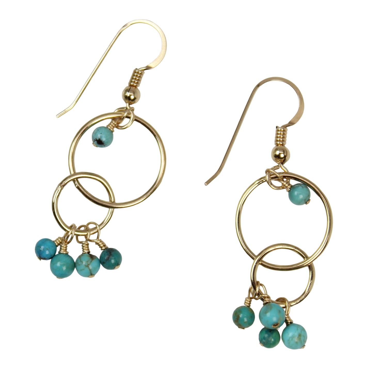 A single turquoise bead is meticulously wire-wrapped within the larger upper hoop, while a cluster of four vibrant baubles dangles from the smaller lower ring. The combination of warm gold tones and the rich, natural blue-green of the turquoise creates a timeless look that transitions perfectly from casual daywear to special evening outings.