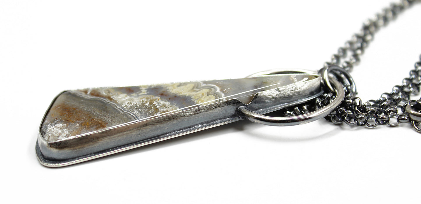 A beautiful, handcrafted sterling silver pendant featuring a unique 3-inch tapered Crazy Lace Agate stone. Designed and fabricated by Kathy Bankston, this necklace combines high-quality materials with bold, modern style. Ships ready for gifting.