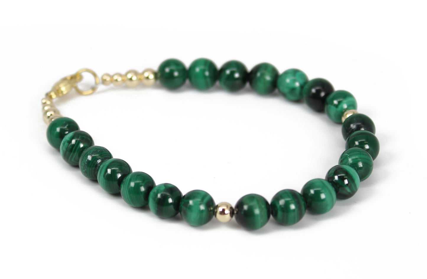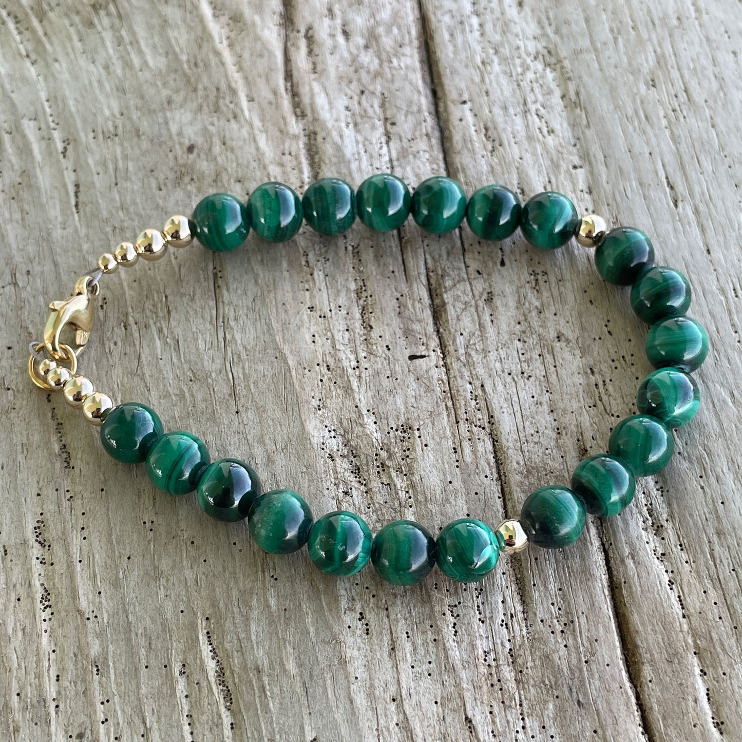Add a rich touch to your jewelry collection with this Malachite bead bracelet. Known for its striking deep green banding, each 7mm Malachite bead is round, smooth, and hand-selected for its unique natural patterns.