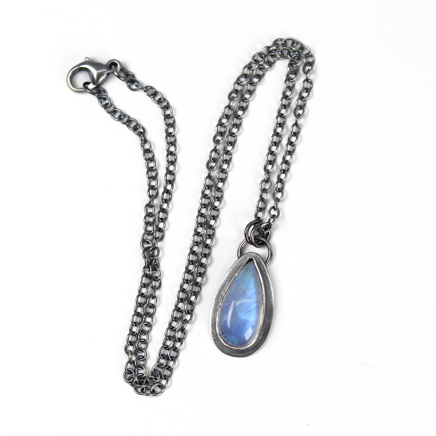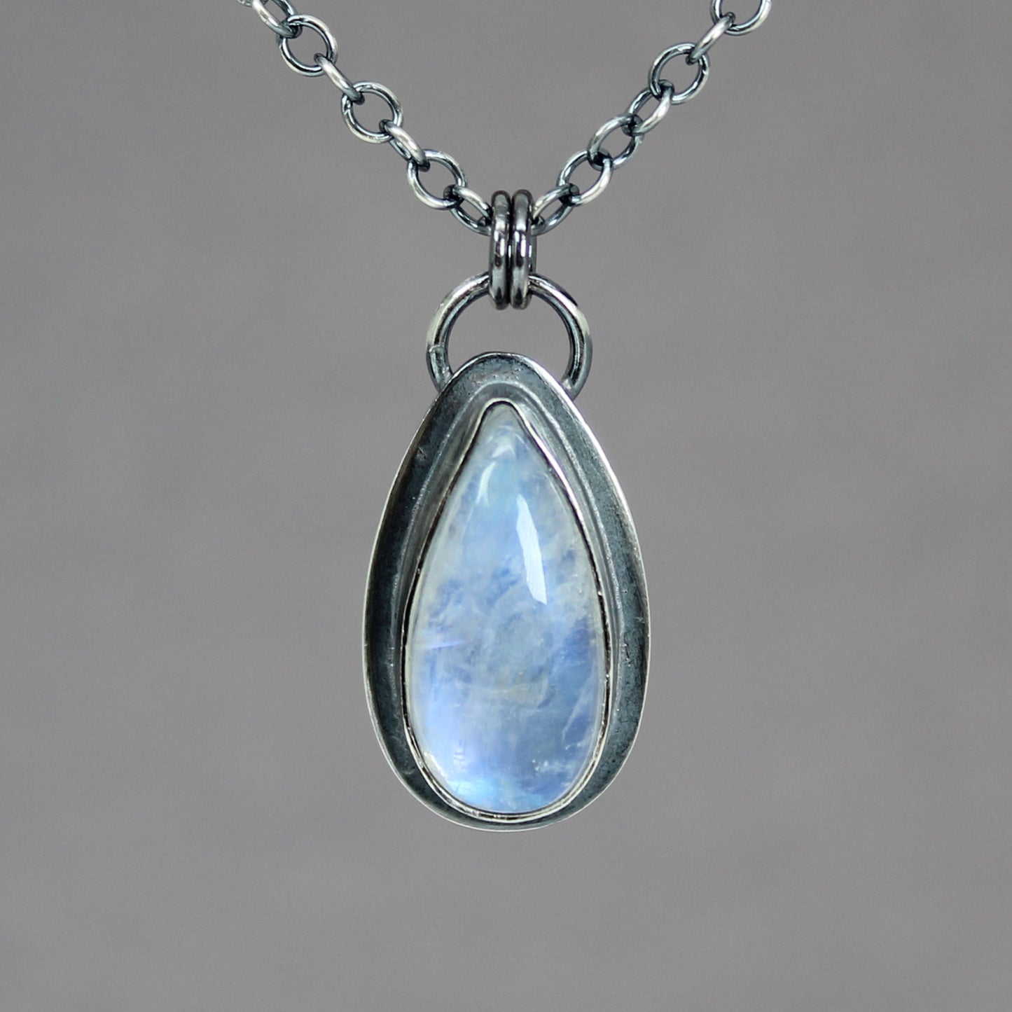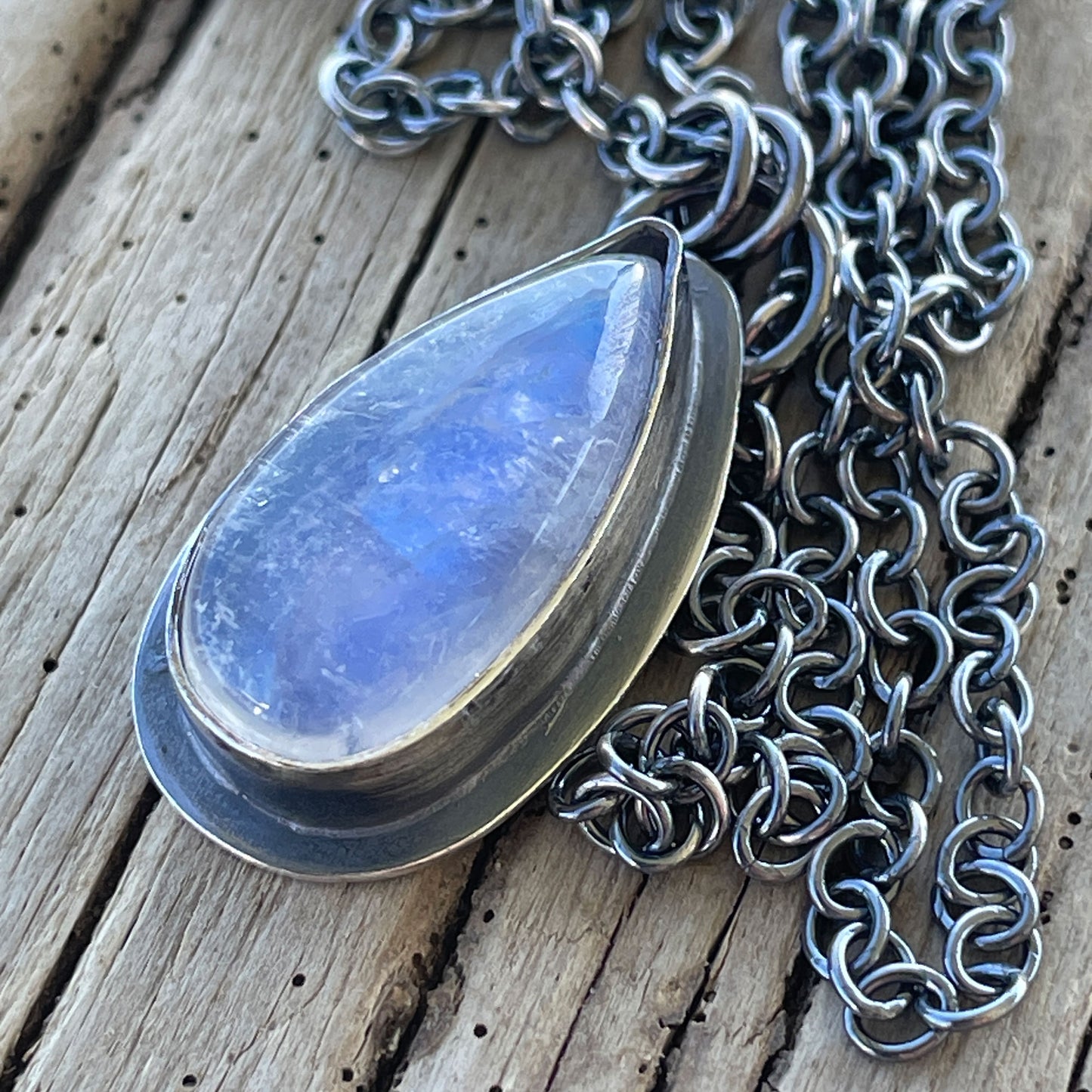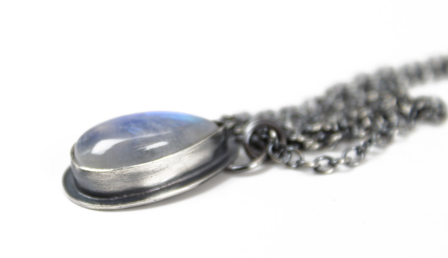 Capture the ethereal glow of the moon with this one-of-a-kind Moonstone Teardrop Pendant. Hand-fabricated in my studio, this piece features a luminous natural moonstone with a striking blue flash, meticulously secured in a custom sterling silver bezel setting.