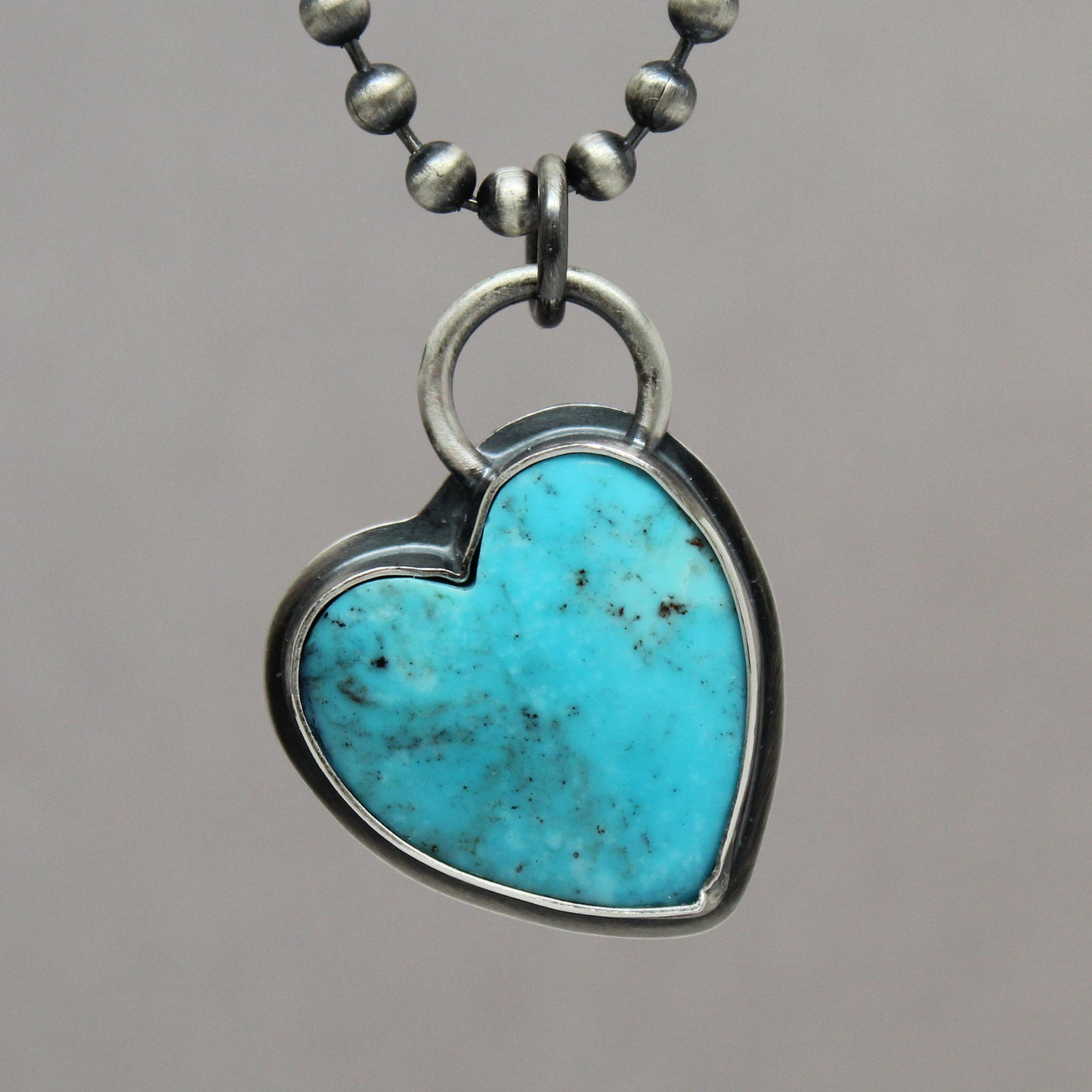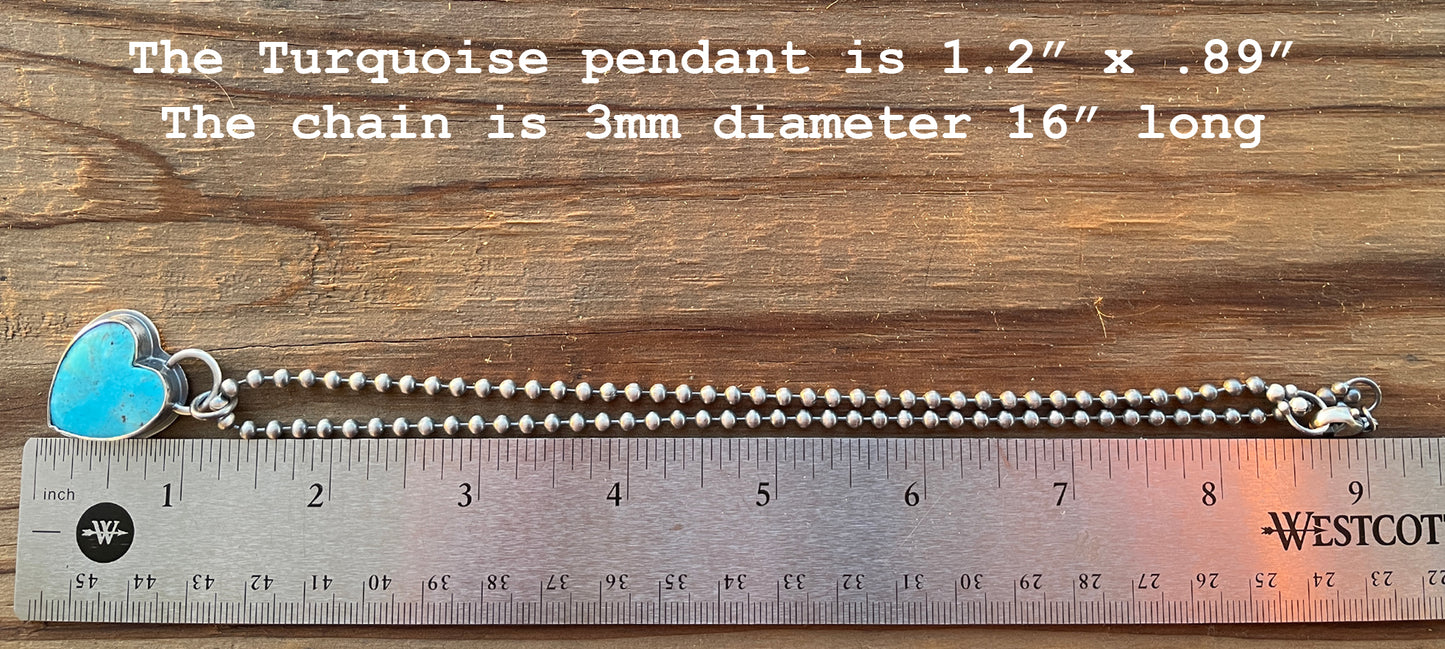 This beautiful Southwestern Turquoise heart pendant is handcrafted with care and attention to detail. The Turquoise stone is polished to a brilliant shine, showcasing its vibrant blue turquoise color. It is bezel set in hand fabricated setting. The backside has makers mark and 925 hallmark . The silver has been antiqued and polished to add depth and beauty.