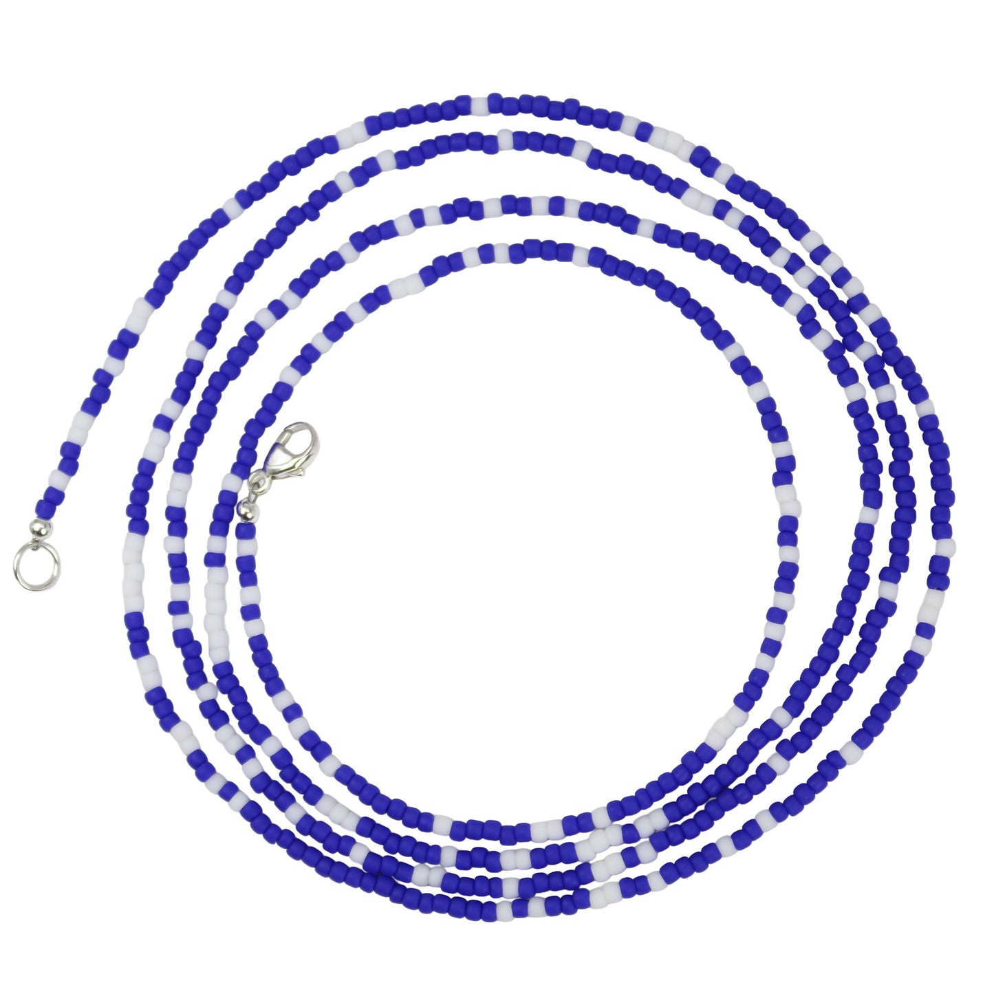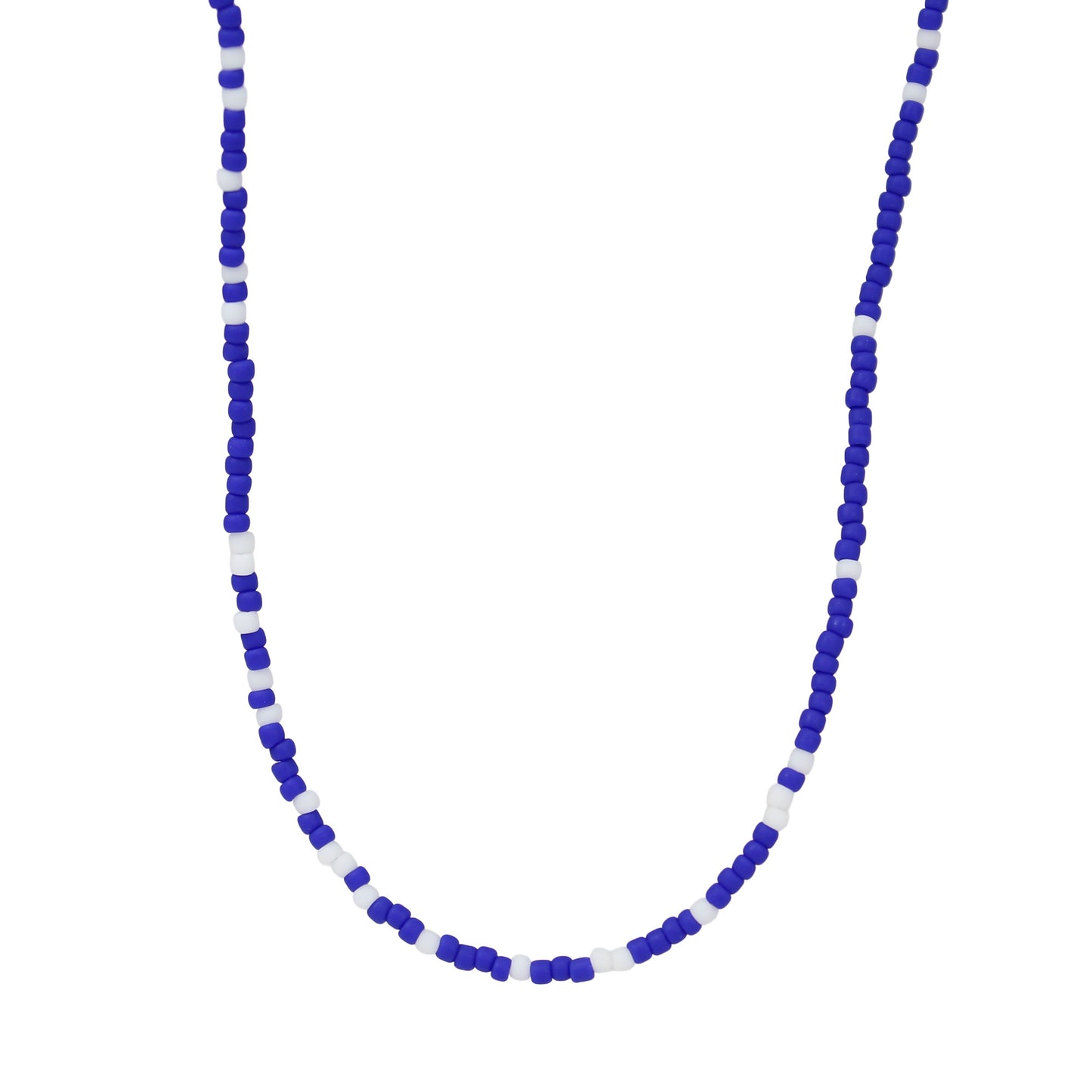This delicate necklace is a timeless addition to any jewelry collection. Handcrafted with tiny frosted navy blue and white seed beads, it offers a touch of nautical chic with a minimalist design.